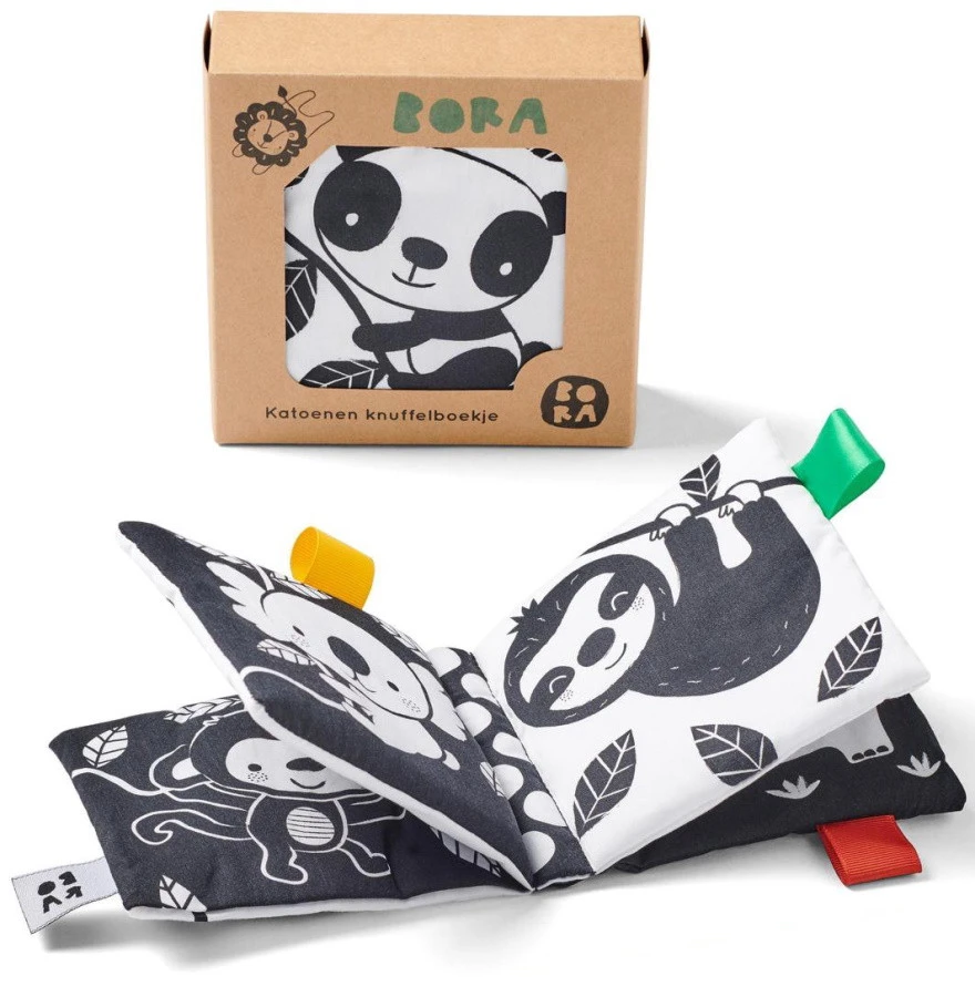 Wat een leuk boekje is het Bora in de dierentuin kinderboek! Het boekje is gemaakt van katoen en heeft 8 pagina’s met mooie dieren illustraties, van bijvoorbeeld een aap en panda. De illustraties zijn in zwart wit, omdat pasgeboren baby’s afbeeldingen beter kunnen zien in hoog contrast.