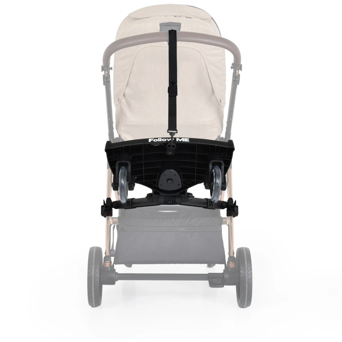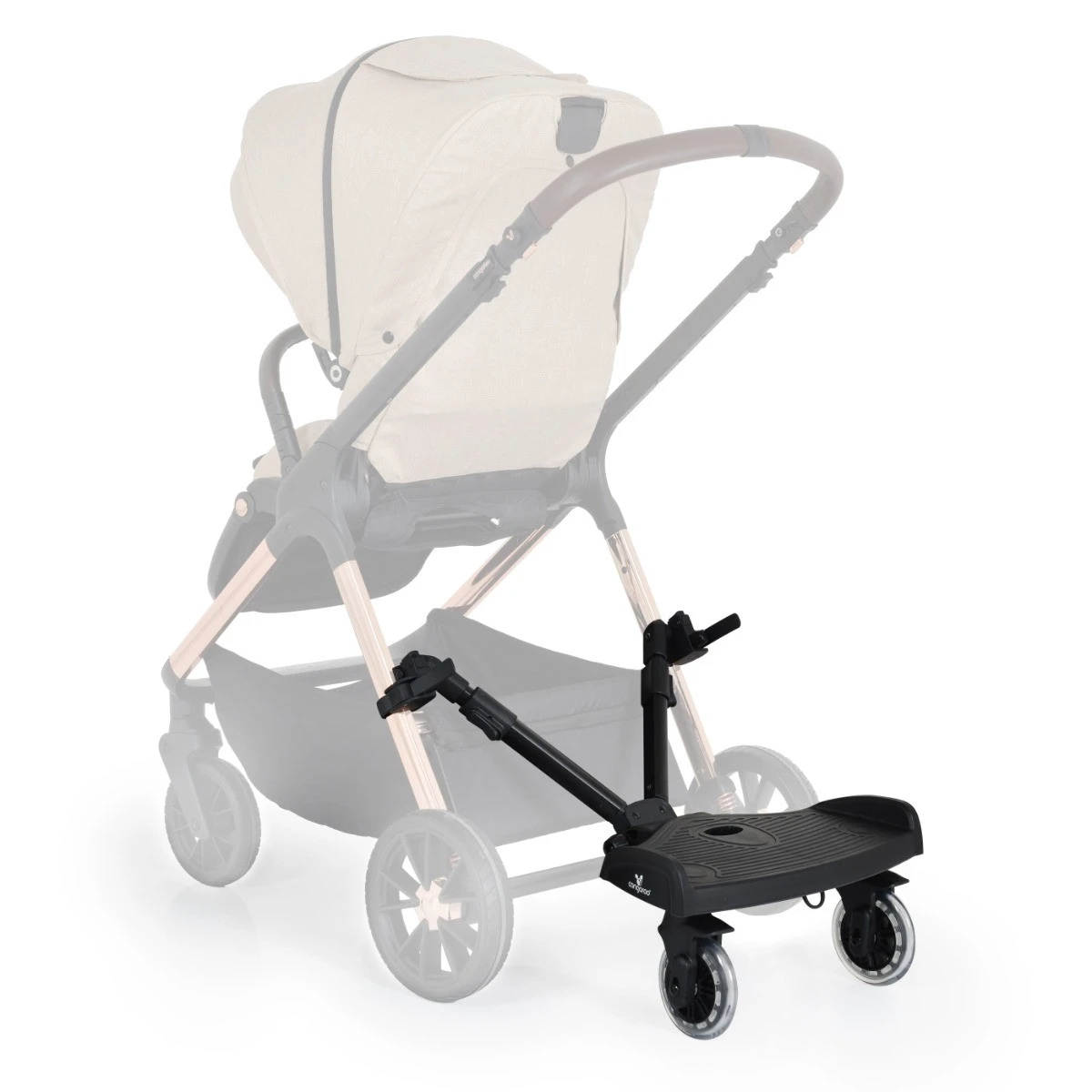 Dit meerijdplankje is universeel. Door de verstelbare bandjes waarmee je hem bevestigd, kan deze aan bijna elke kinderwagen bevestigd worden. Door de zwenkwieltjes blijft je wagen ook makkelijk te bewegen.