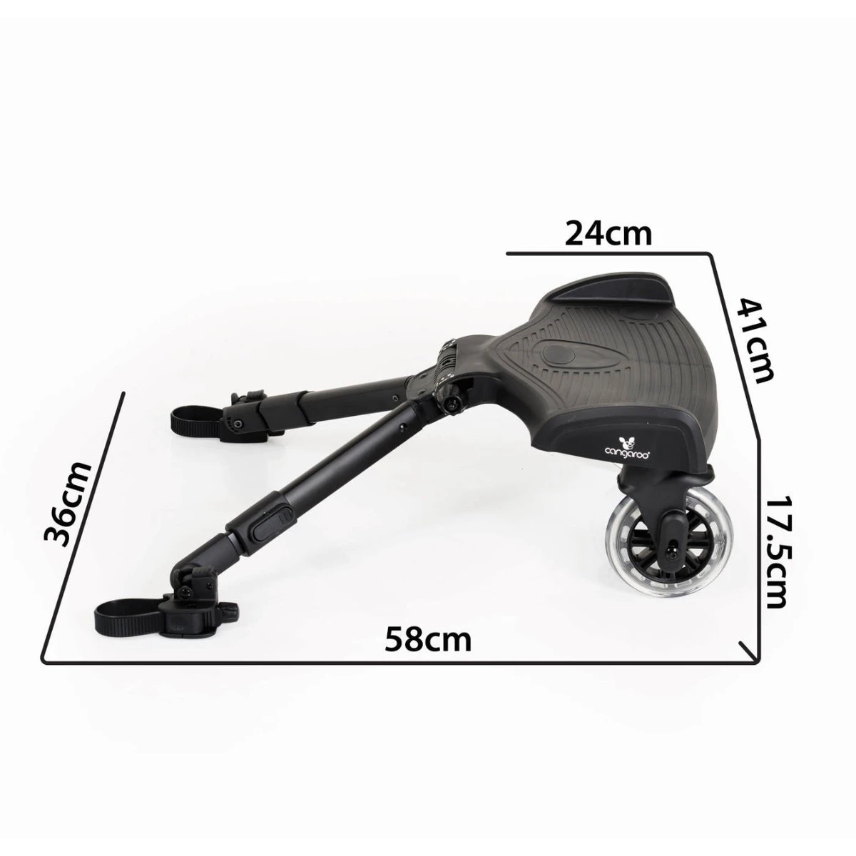 Het meerijdplankje is 58 x 41 x 17.5 cm groot en kan compact ingeklapt worden tot 59 x 14 x 32 cm. Hij is geschikt voor kindjes vanaf 15 maanden tot een maximumgewicht van 20kg. Wanneer je het plankje even niet gebruikt kun je hem makkelijk omhoog klappen, zo hoef je hem niet helemaal te demonteren.