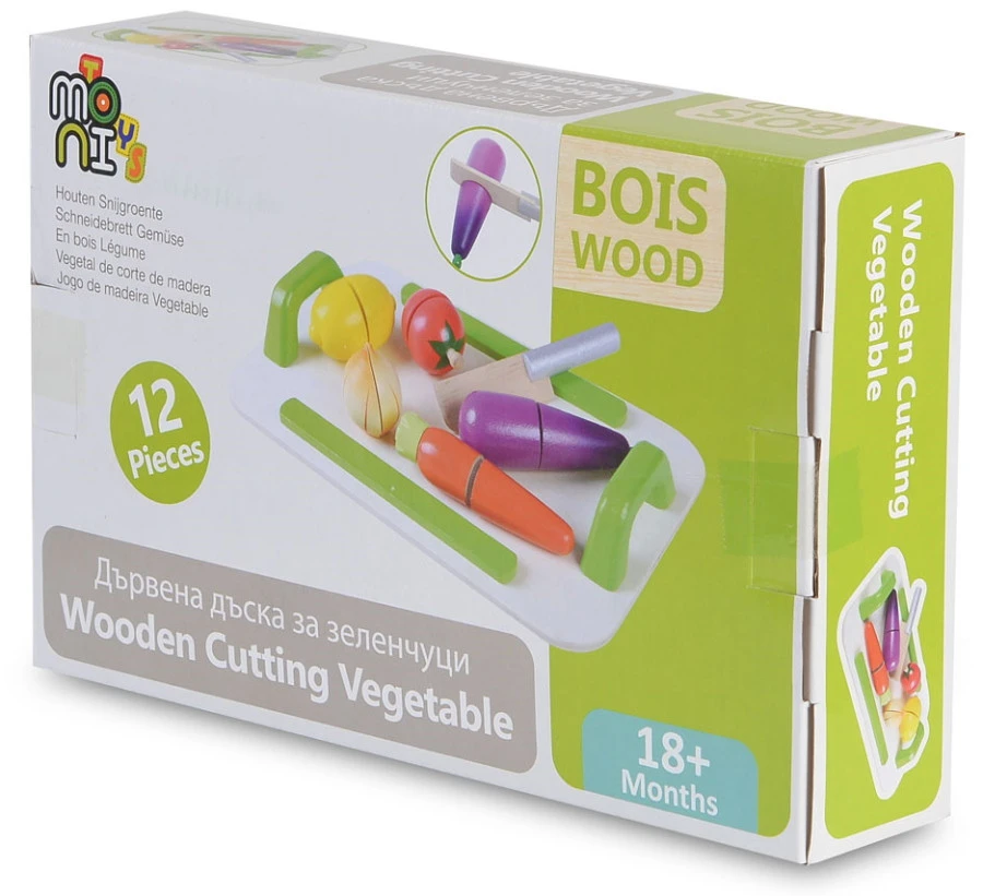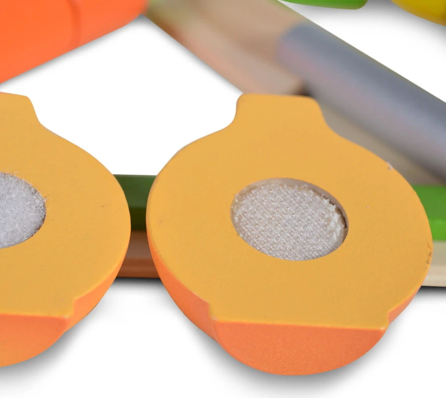 De groenten snij set bestaat uit 12 delen en bevat een snijplank, mesje en 5 soorten groenten. Het houten voedsel heeft klittenband, waarmee je kindje het eten los van en vast aan elkaar kan maken.Â