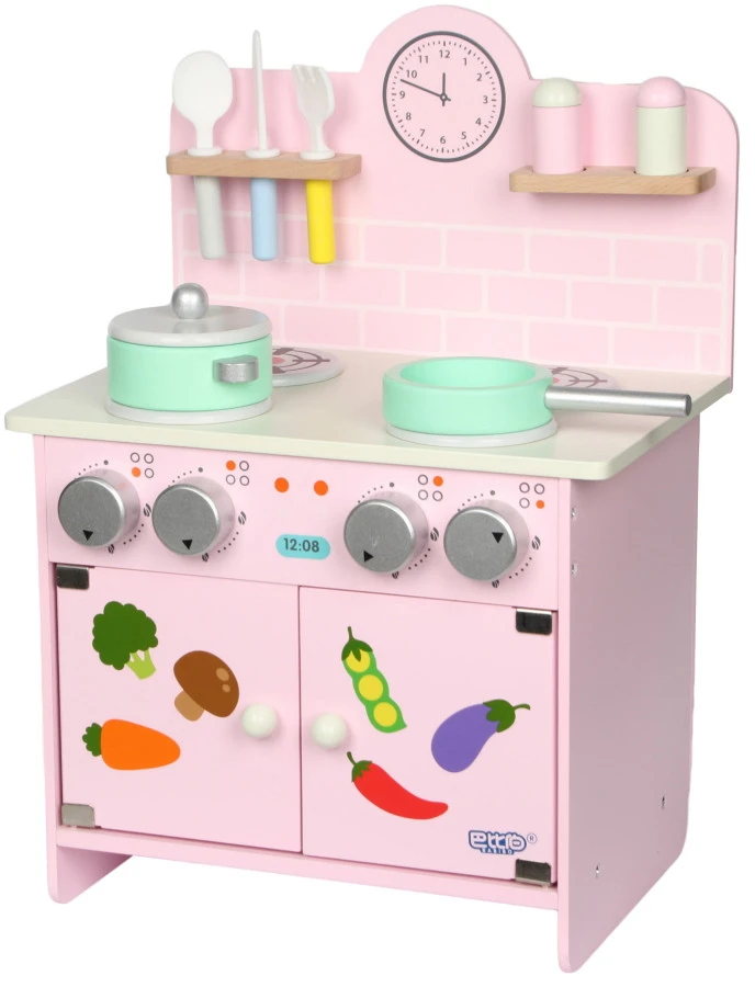 Je kleine wordt een echt keukenprins(es)je met dit leuke houten keukentje van Eco Toys! Het keukentje is bedrukt met een vrolijke print van allerlei groenten en zal een echte eye-catcher zijn voor in de speel/woonkamer.