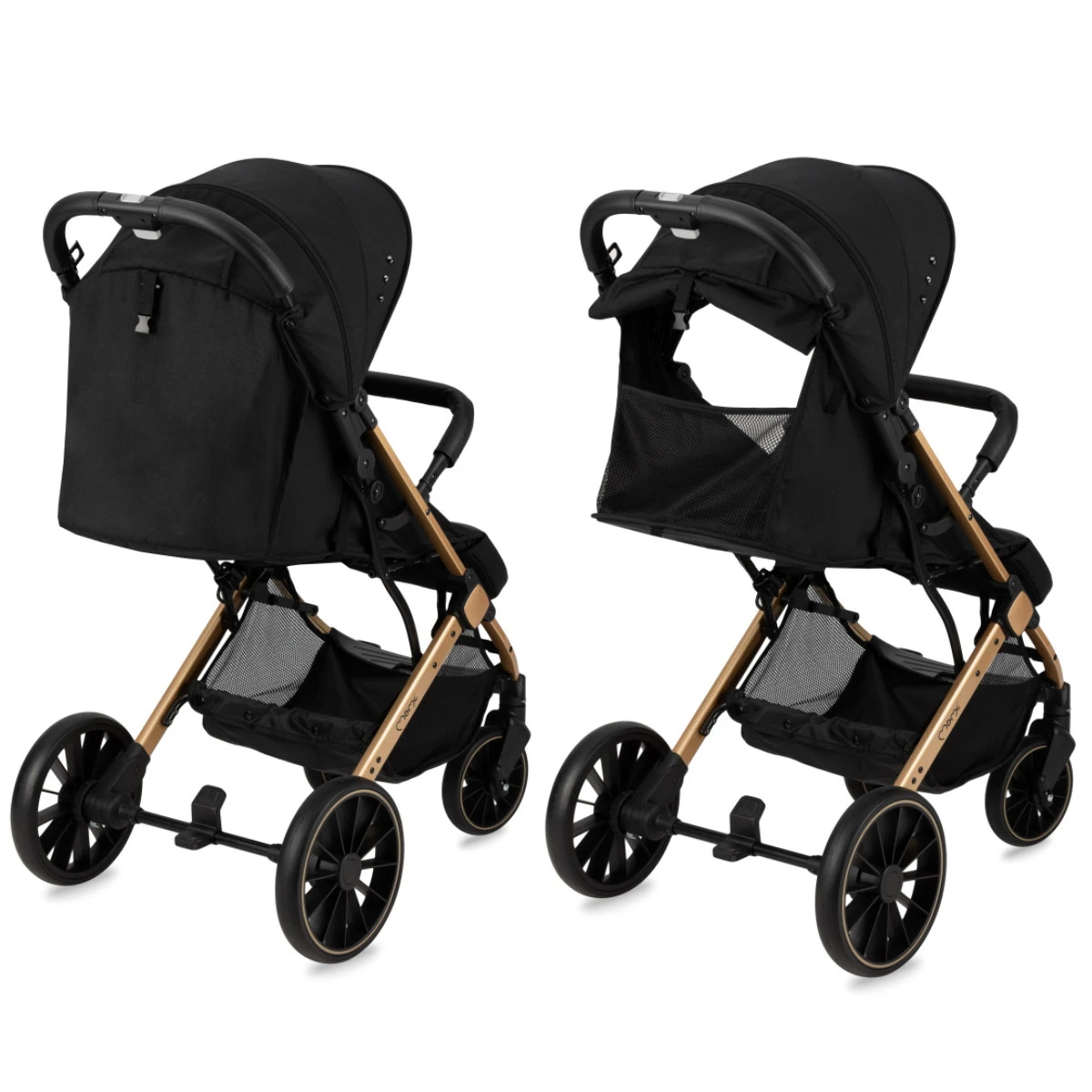De wagen is voorzien van een ruime zonnekap met mooi design die je kindje beschermd tegen verschillende weersomstandigheden. De kap heeft een kijkluikje, zodat je je kindje altijd kunt zien. Dankzij de 5-punts veiligheidsgordel en de valbeugel zit je kindje altijd veilig in de wagen. De handvaten zijn tevens stijlvol afgewerkt met eco-leer. Ook heeft de wagen een ruime boodschappenmand waar je de nodige spulletjes in op kunt bergen.Â