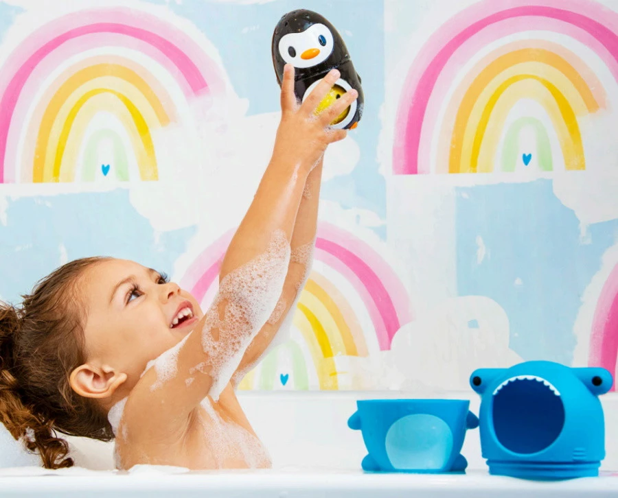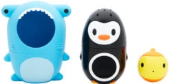 Het Sharky & Pals 3-delig badspeeltje van Munchkin zorgt voor eindeloos badplezier! Dit badspeeltje heeft meer te bieden dan op het eerste gezicht te zien is. Deze haai heeft een verrassing in zijn buikje, namelijk een pinguïn en een visje.