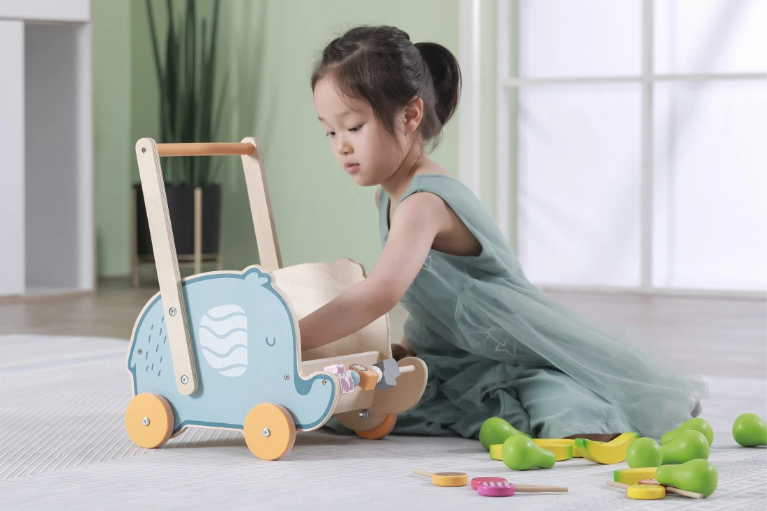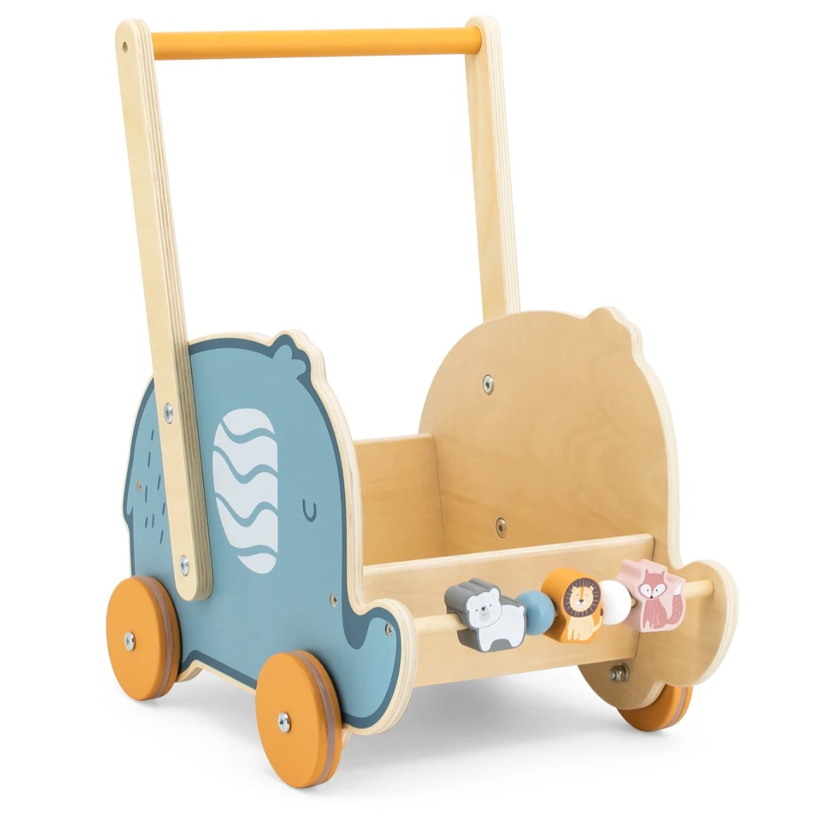 Het wagentje biedt genoeg plek om alle lievelingsknuffels in mee te nemen. Het olifantendesign maakt hem extra schattig. Tevens is de wagen een soort loopwagen die je kleine helpt bij het zetten van de eerste stapjes. Ook heeft de voorkant van de wagen leuke kralen en dierenvormpjes om mee te spelen. Hij is geschikt voor kindjes vanaf 12 maanden.