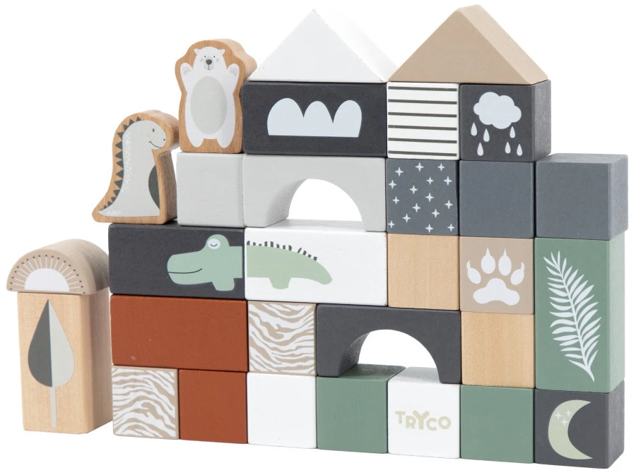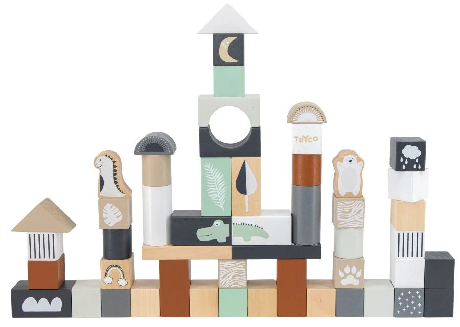 Deze blokkenset bestaat uit 50 stuks blokken. De blokjes zijn gemaakt van degelijk hout en hebben verschillende vormen, kleuren én printjes! Zo zullen de o.a. de dinosaurus, krokodil en ijsbeer het kindje vergezellen tijdens het bouwen.